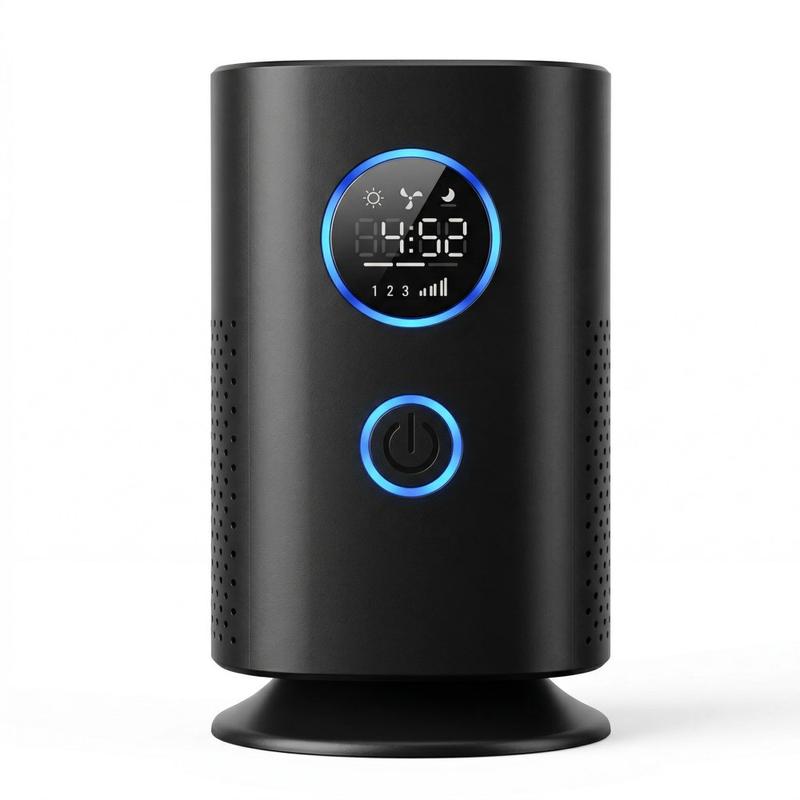 - Ecranul circular OLED afișează ora, viteza ventilatorului, modul de repaus și mementourile privind înlocuirea filtrului.