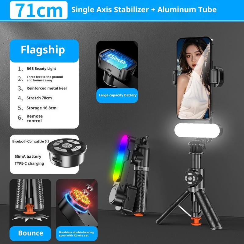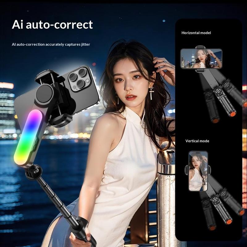 Stabilizator cu cardan pentru selfie stick Q34 AI Anti-Shake - Suport extensibil pentru telefon de 71 cm, cu lumină de înfrumusețare RGB și telecomandă