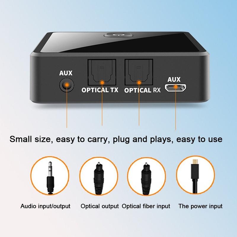 Echipat cu fibre optice, 3,5 mm AUX și interfețe RCA (roșu/alb), adaptorul acceptă o gamă largă de sisteme audio. Această flexibilitate facilitează conectarea televizoarelor, computerelor, amplificatoarelor de putere, difuzoarelor și sistemelor de sunet, menținând în același timp performanțe audio clare, cu latență redusă.