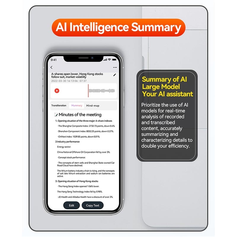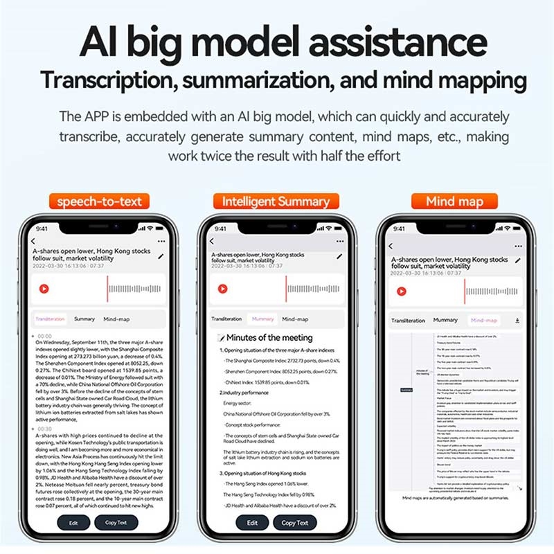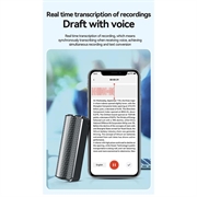 Transcriere bazată pe AI: Conectați-vă la AIREC-APP prin Bluetooth pentru a vă bucura de transcriere și traducere în timp real în 188 de limbi cu integrare ChatGPT.