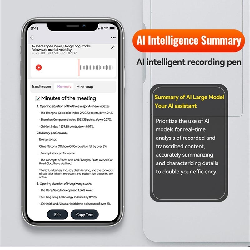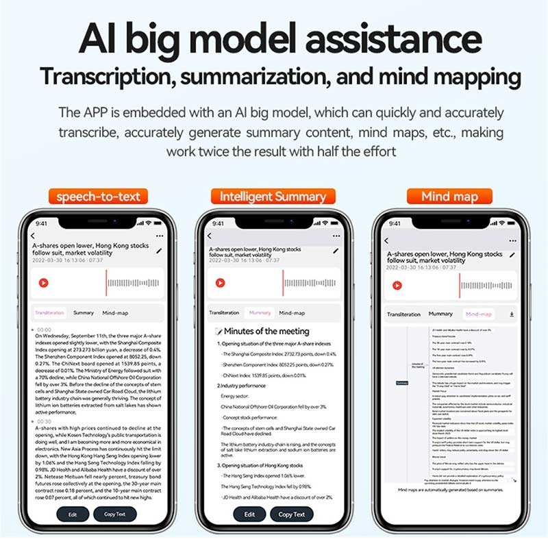 Transcriere bazată pe AI: Conectați-vă la AIREC-APP prin Bluetooth pentru a vă bucura de transcriere și traducere în timp real în 188 de limbi cu integrare ChatGPT.