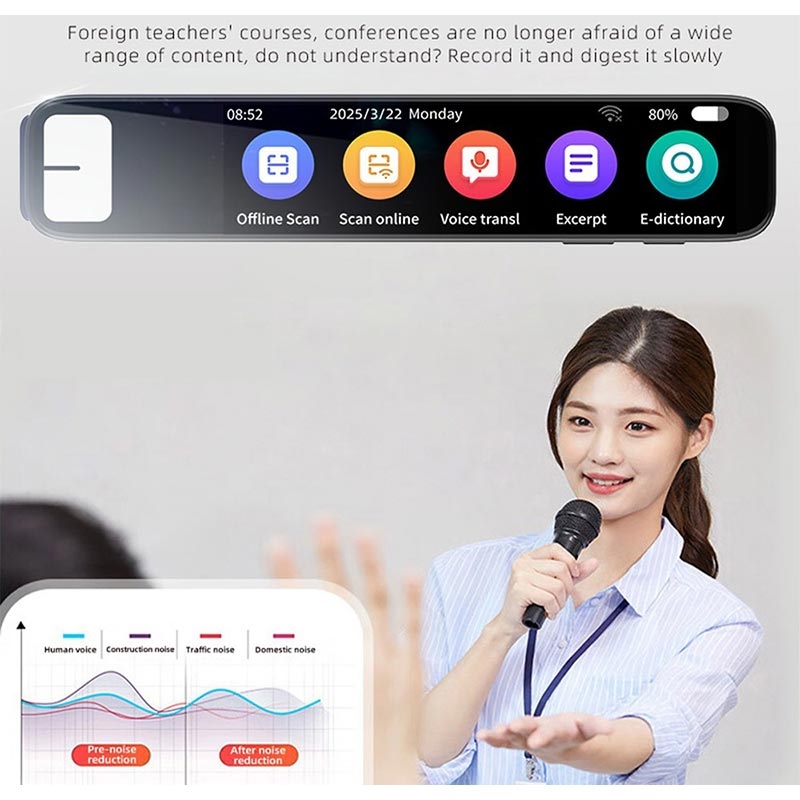 Traducerea foto utilizează tehnologia de recunoaștere optică a caracterelor (OCR) pentru a scana și traduce instantaneu textul din imagini, ceea ce o face deosebit de utilă pentru citirea semnelor, meniurilor sau documentelor în timpul călătoriilor. De asemenea, traducerea vocală în 134 de limbi face din S08B unul dintre cele mai versatile traducătoare portabile disponibile.