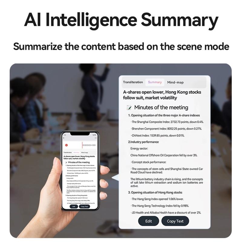 - Transcriere alimentată de AI: Conectați-vă la AIREC-APP prin Bluetooth 5.3 pentru transcriere și traducere în timp real în 188 de limbi, cu ajutorul ChatGPT.