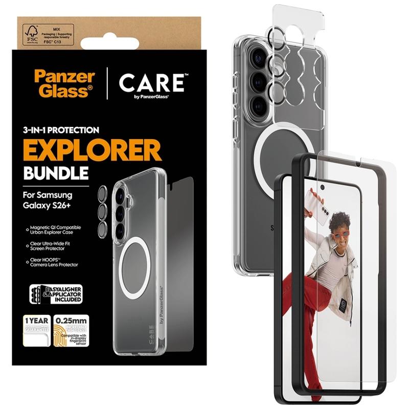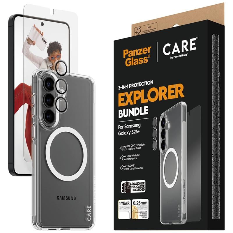 Pachetul Care by PanzerGlass 3-în-1 Explorer pentru Samsung Galaxy S26+ - Protector de ecran + Protector de lentile Hoops + Carcasă magnetică Urban Combat, EasyAligner