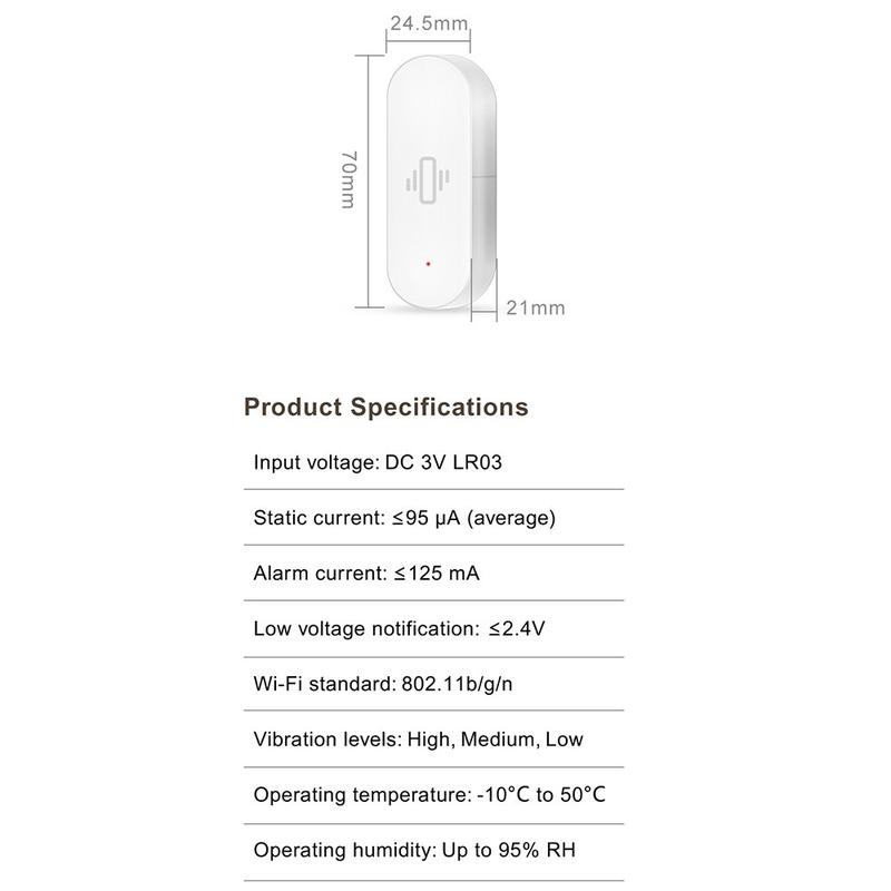 Acest senzor necesită o conexiune WiFi stabilă de 2,4 GHz și o baterie AAA (nu este inclusă). Pentru rezultate optime, montați-l ferm pe suprafața pe care doriți să o monitorizați și testați setările de sensibilitate pentru a evita alertele false.
