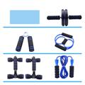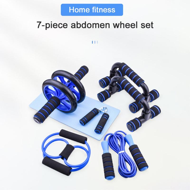 Set de antrenament pentru acasă, format din 7 piese - rolă pentru abdomene, bare pentru flotări, coardă de sărit, dispozitiv de strângere pentru mâini și dispozitiv de întindere pentru piept