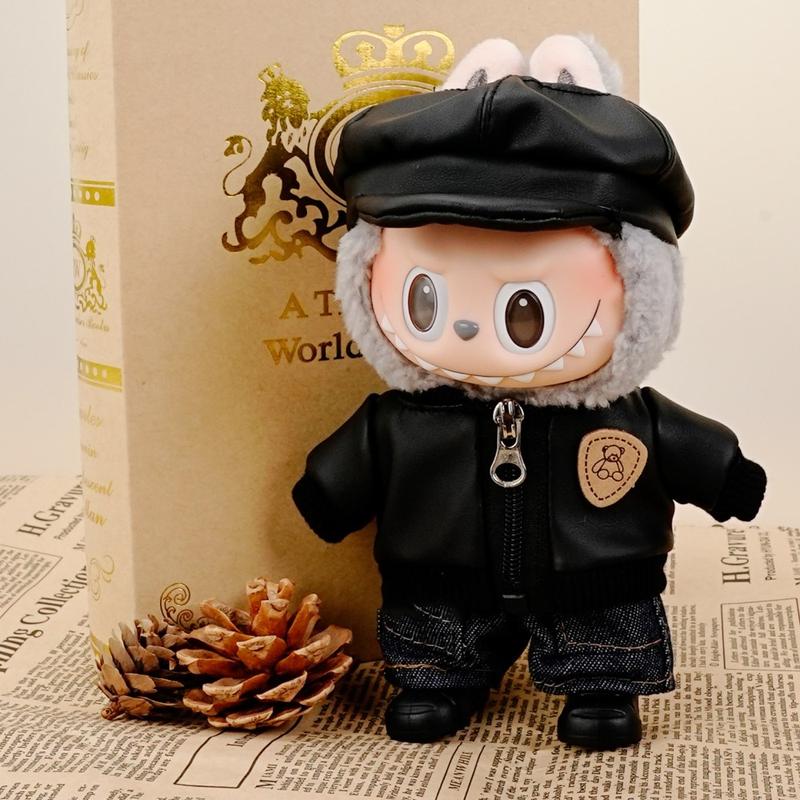 Set de costume stil aviator de epocă pentru păpușa Labubu 17cm - costum schimbabil 5Pcs cu tricou, jachetă, blugi, pălărie și pantofi pentru Figurine Gen 1 / 2 / 3