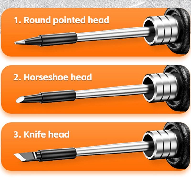 - Include trei vârfuri interschimbabile: rotund ascuțit, în formă de potcoavă și cuțit