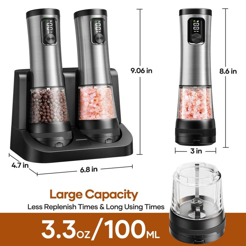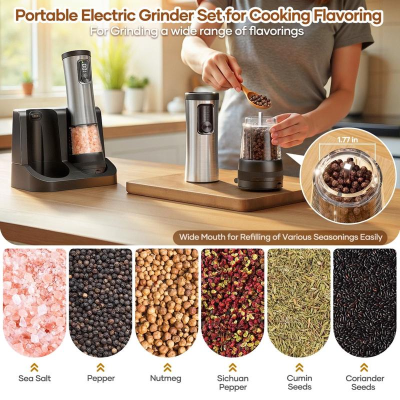 Set de tocător electric de condimente din oțel inoxidabil reîncărcabil - cap de măcinare ceramic, reglare a grosimii pe 5 niveluri, capacitate de 100 ml