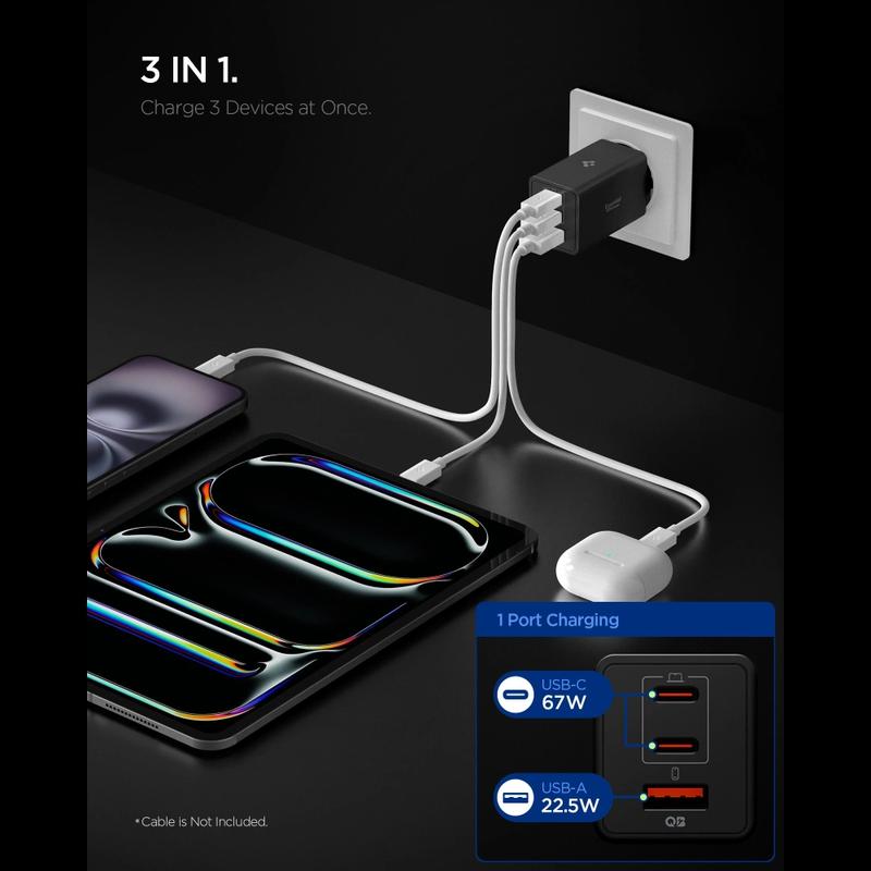 Încărcător de perete cu 3 porturi Spigen Essential EE673EU - Încărcător rapid GaN Pro de 67W cu două porturi USB-C și USB-A