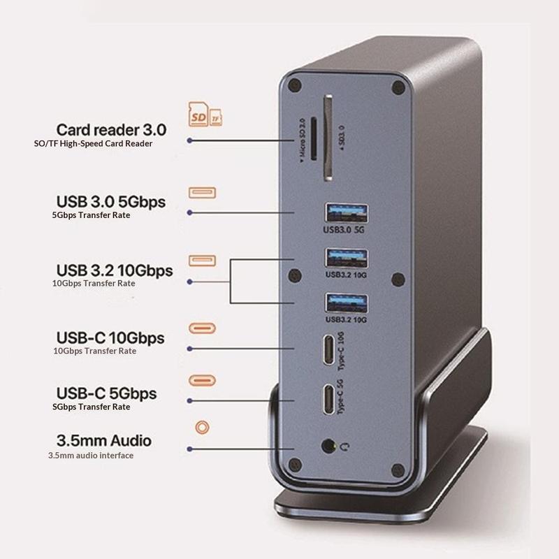- Extindere 15-în-1: porturi USB, triplu video, cititor de carduri SD/TF, Ethernet și audio de 3,5 mm într-un singur hub