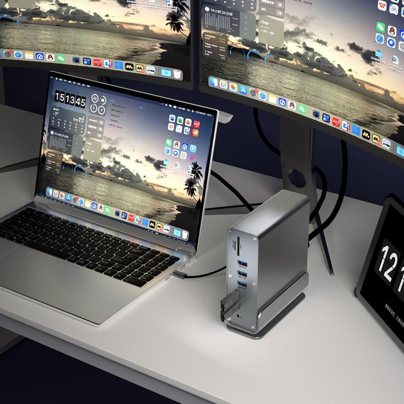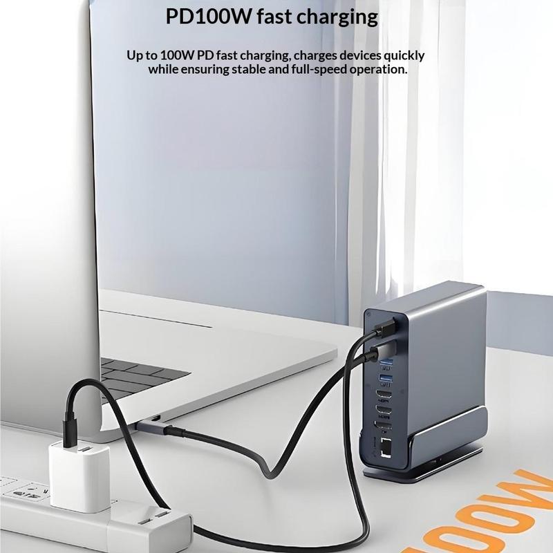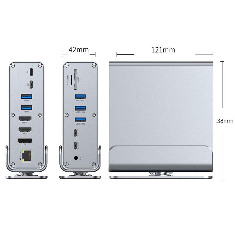 Transformați un singur port USB-C într-o stație de lucru completă cu această stație de andocare USB-C 15-în-1 cu suport integrat. Concepută pentru laptopuri și tablete moderne, aceasta vă extinde configurația cu multiple porturi USB, ieșiri triple pentru afișaj, internet rapid prin cablu și cititoare de carduri - ideală pentru birouri la domiciliu, studiouri creative și fluxuri de lucru cu productivitate ridicată. Carcasa din aluminiu metalic arată elegant pe biroul dvs., ajută la disiparea căldurii, iar suportul încorporat menține dispozitivul poziționat corect pentru o ergonomie mai bună.