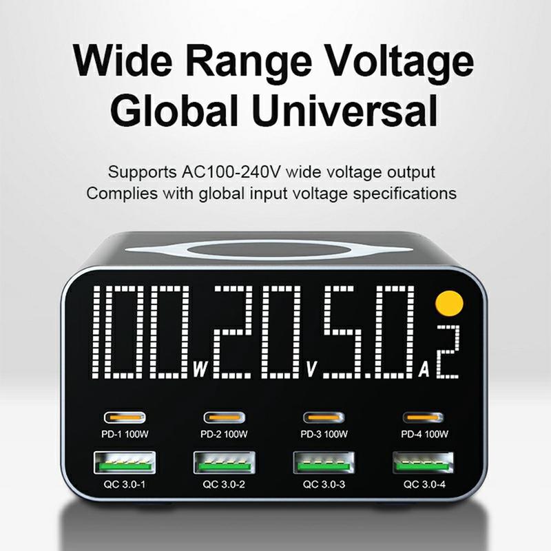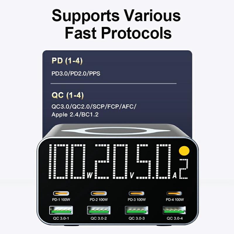 Stație de încărcare de birou WLX-M1 120W - încărcător rapid GaN USB-C cu 8 porturi și încărcare wireless (mufă UE)