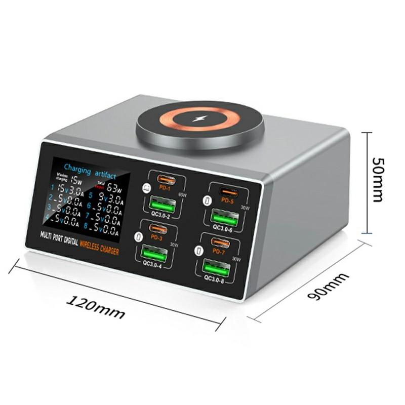 - Hub de încărcare 9 în 1 cu 8 porturi cu fir + 1 încărcător magnetic wireless