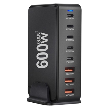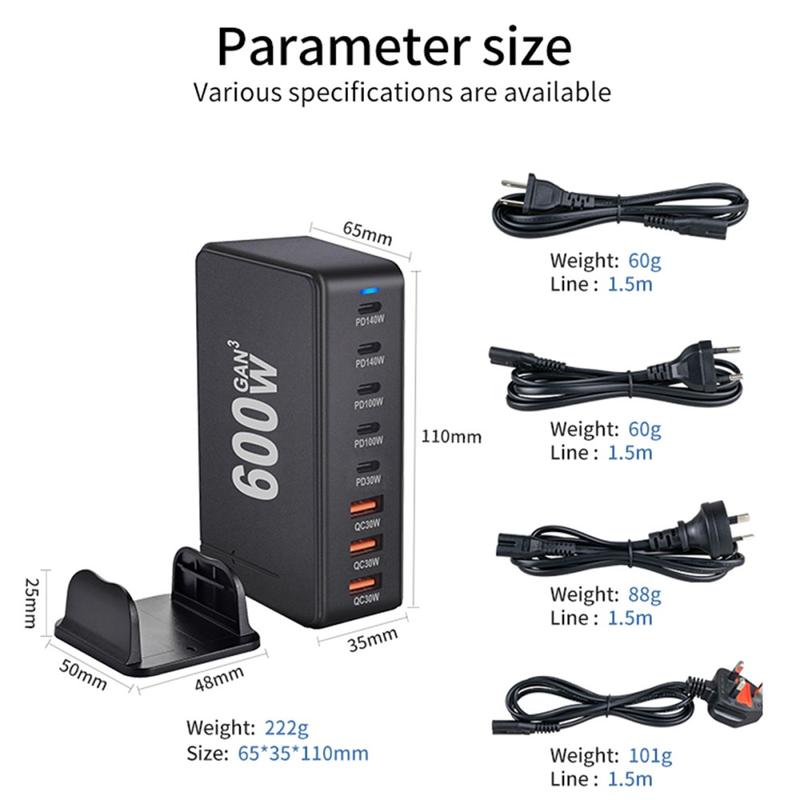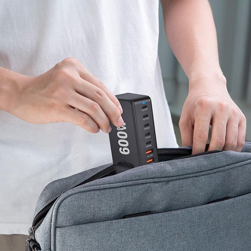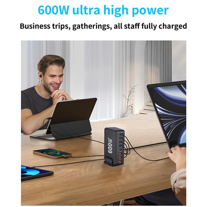 Stație de încărcare de birou 600W GaN - 8 porturi (5x USB-C + 3x USB-A) încărcător rapid PD3.1, până la 140W USB-C, distribuție inteligentă a energiei