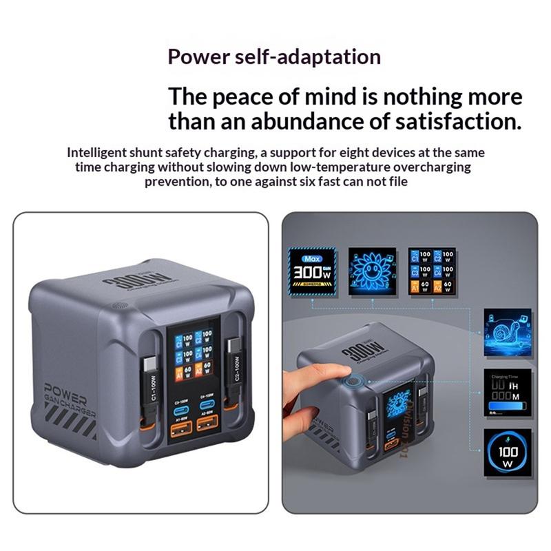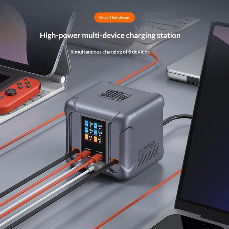 HW866 Stație de încărcare de birou GaN de 300W cu afișaj LCD - Încărcător cu 6 porturi și 2 cabluri USB-C retractabile, priză UE