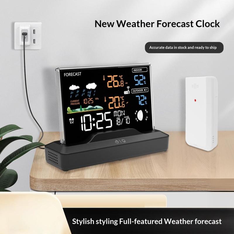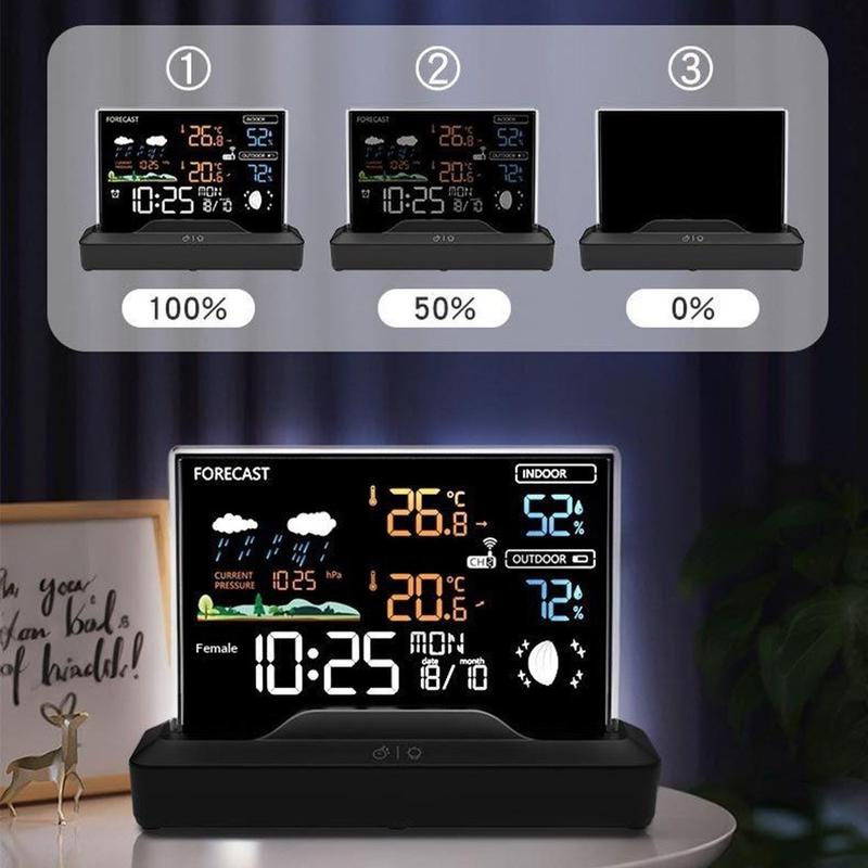 Ecranul LCD color afișează informații cheie într-un format ușor de citit, inclusiv temperatura, umiditatea, prognoza meteo, ora, faza lunii și presiunea barometrică. Acest lucru face ușoară verificarea mai multor detalii importante simultan, fără a fi nevoie de dispozitive separate. Lumina de fundal îmbunătățește vizibilitatea, iar modul USB oferă 3 setări de luminozitate, astfel încât să puteți regla afișajul în funcție de camera și condițiile de iluminare.