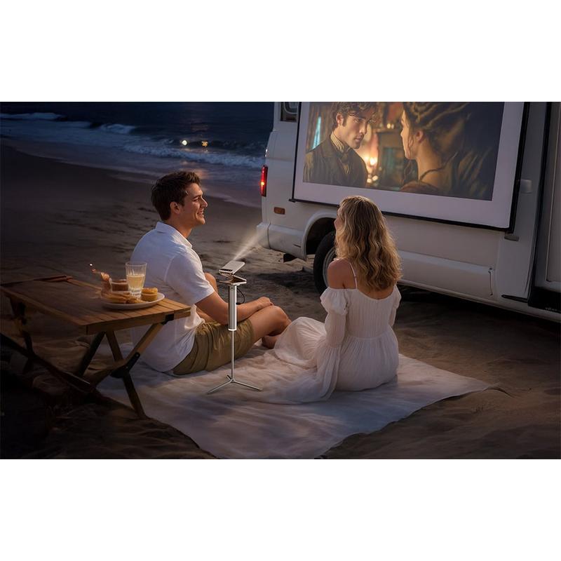 - Seară de film în aer liber: așezați suportul pe sol, setați înălțimea la 33 cm sau 43 cm și alimentați proiectorul de la bateria încorporată
