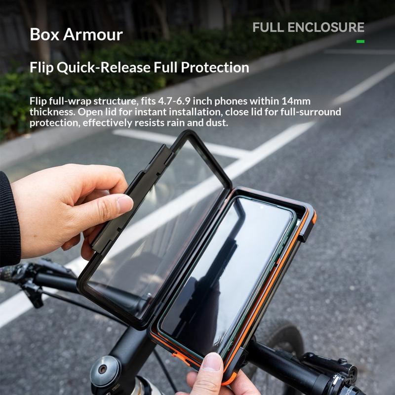 Acest suport ROCKBROS este o alegere inteligentă dacă doriți protecție împotriva intemperiilor și andocare magnetică rapidă. Vă păstrează telefonul mai sigur, îmbunătățește vizibilitatea cu rotație completă și vă permite să utilizați încărcarea și camera fără a scoate dispozitivul. Ideal pentru cicliști care doresc confort fără a sacrifica protecția.