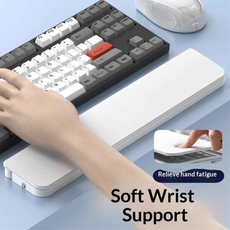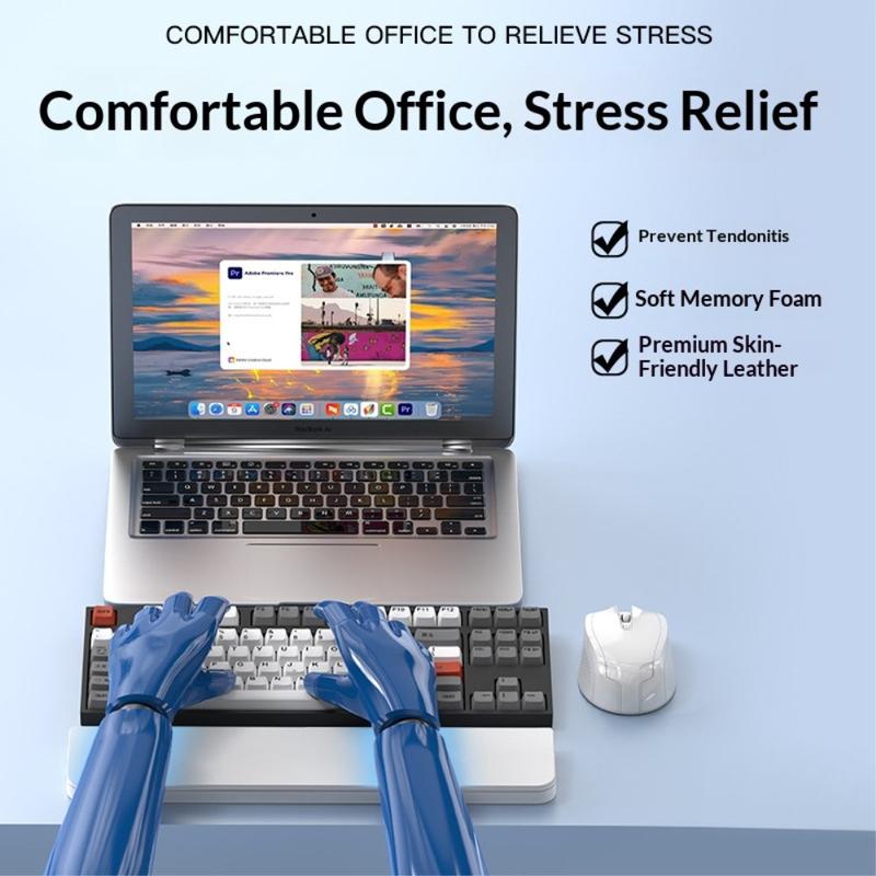 Suportul pentru încheietura mâinii este fabricat din poliuretan moale și căptușeală din spumă de înaltă calitate pentru a oferi un suport blând și stabil pentru încheietura mâinii. Designul său ergonomic ajută la reducerea presiunii și a oboselii în timpul sesiunilor prelungite de tastare, muncă de birou sau studiu.