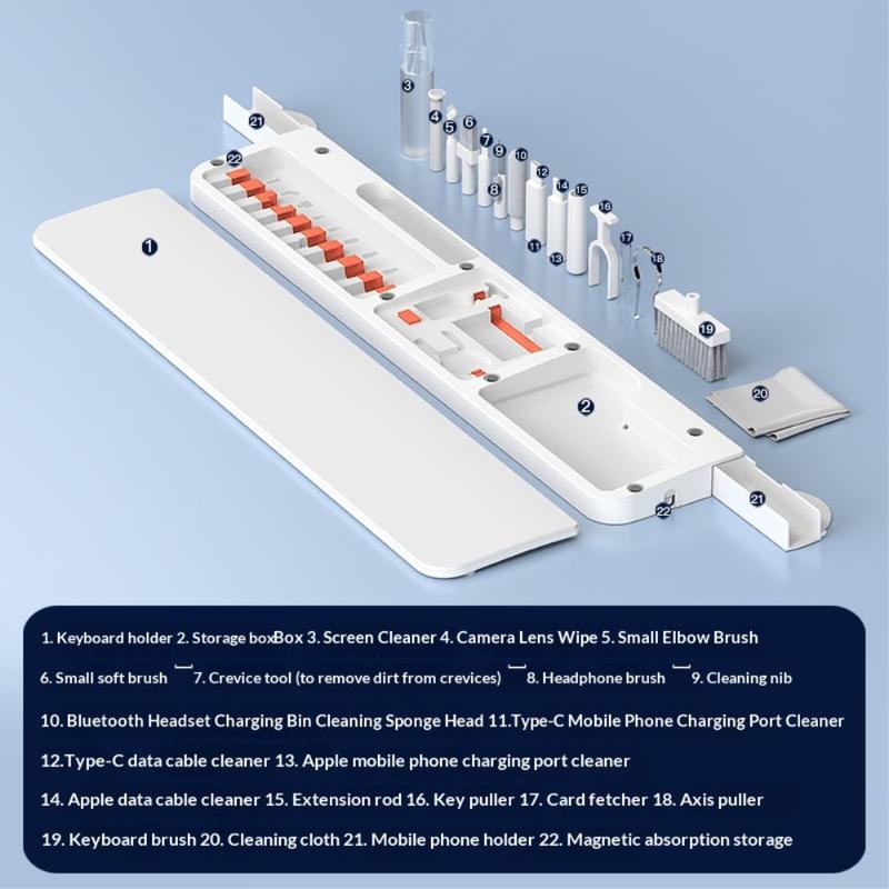 În interiorul suportului pentru încheietura mâinii se află un set complet de curățare cu 22 de unelte, conceput pentru curățarea în profunzime a tastaturilor, căștilor, porturilor de încărcare a telefoanelor, lentilelor camerelor foto, comutatoarelor și altor dispozitive electronice. Fiecare instrument are propriul său loc, asigurând o organizare ușoară și acces rapid.