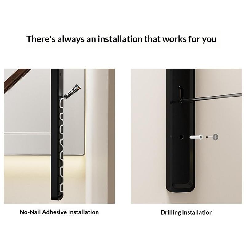 Construit din aluminiu rezistent, cu tije întărite, suportul oferă un sprijin stabil pentru rufele de zi cu zi. Poate fi instalat folosind o bandă adezivă puternică, fără a fi nevoie de găurire, sau montat cu șuruburi pentru stabilitate suplimentară, fiind potrivit pentru o varietate de suprafețe de perete.