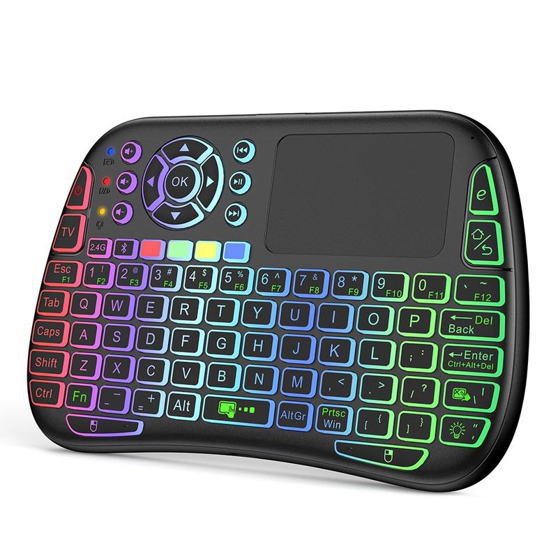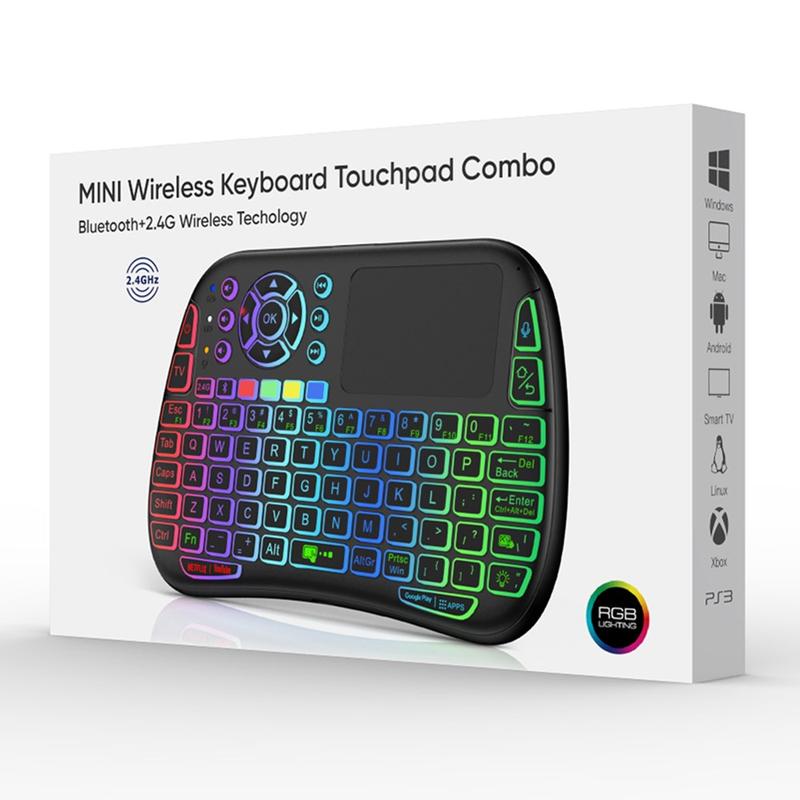 Tastatura acceptă atât conexiunea wireless de 2,4 GHz prin receptor USB, cât și Bluetooth 5.0 compatibil, oferindu-vă flexibilitate pe multe dispozitive, inclusiv televizoare inteligente, sisteme HTPC, laptopuri, tablete și dispozitive Android. Touchpad-ul încorporat cu gesturi multi-touch înlocuiește mouse-ul, iar iluminarea RGB colorată îl face ușor de utilizat chiar și în camere întunecate.