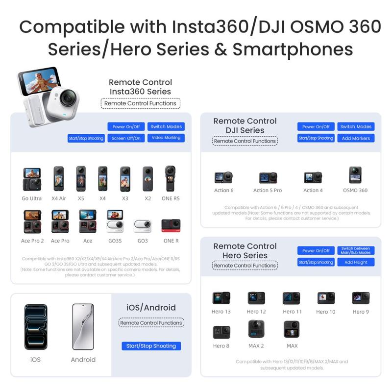 - Compatibilitate largă - funcționează cu smartphone-uri iOS și Android și acceptă camere de acțiune Insta360, GoPro Hero și DJI