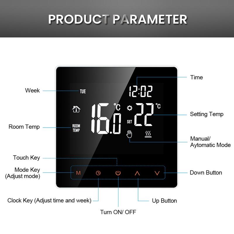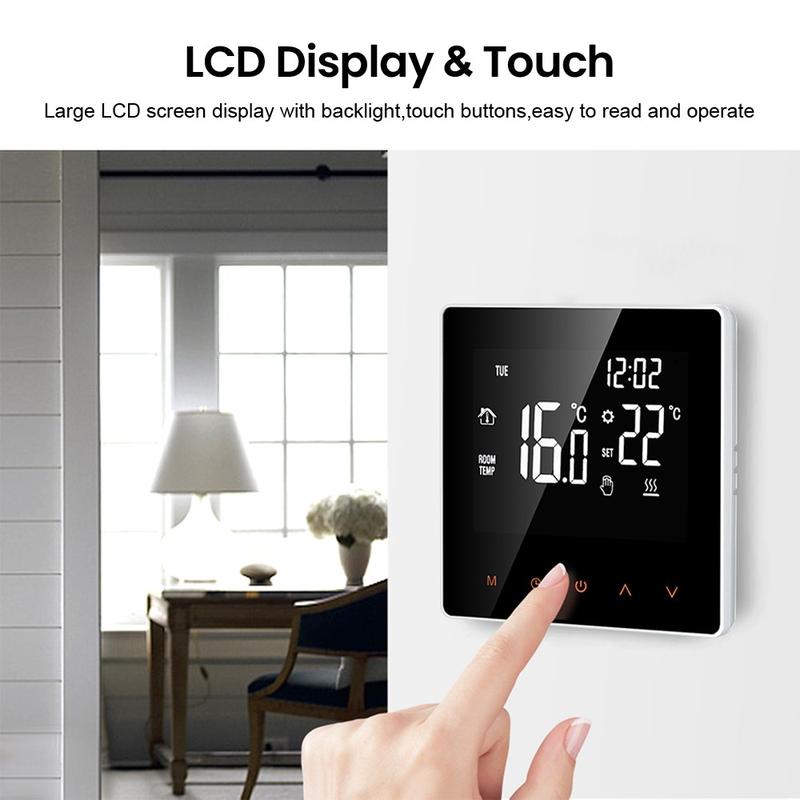 Ecranul tactil LCD mare cu iluminare din spate este ușor de citit atât ziua, cât și noaptea. Designul său elegant dintr-o singură bucată conferă termostatului un aspect îngrijit și modern, în timp ce suprafața rezistentă la zgârieturi îl ajută să rămână prezentabil în timp. Puteți alege între modul manual pentru reglare directă și modul automat pentru încălzire programată, în funcție de rutina zilnică și de preferințele personale.