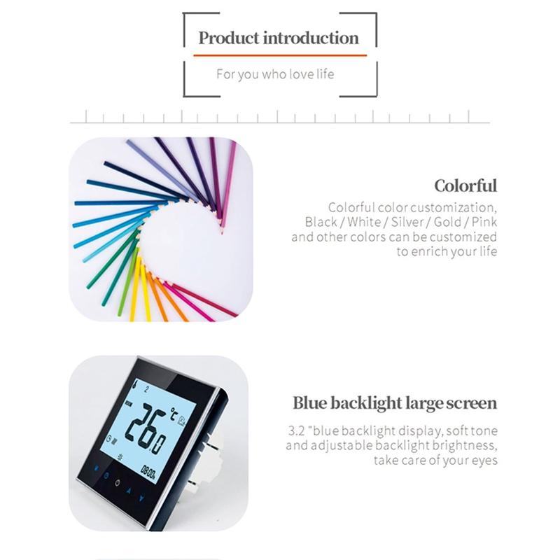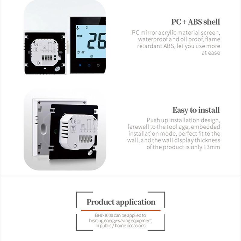 Termostatul inteligent BHT-1000GB este conceput pentru a asigura un control precis și stabil al sistemelor de încălzire electrică prin pardoseală în locuințe, hoteluri, apartamente și alte spații interioare. Datorită reglării precise a temperaturii și interfeței tactile practice, acesta contribuie la crearea unui mediu interior mai confortabil, menținând în același timp o utilizare zilnică simplă. Designul modern al panoului îl transformă într-un element elegant și funcțional care se integrează perfect într-o gamă largă de interioare.