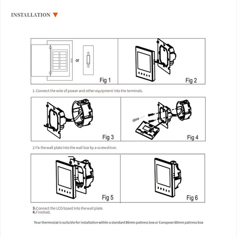 Modelul BHT-1000GB este proiectat pentru instalarea într-o cutie încastrată standard de 86 x 86 mm sau într-o cutie de perete europeană convențională, ceea ce facilitează integrarea sa în multe configurații existente. Compatibilitatea sa largă cu tensiunea adaugă, de asemenea, flexibilitate la instalare, permițându-i să funcționeze într-o gamă largă de medii în care se utilizează încălzirea electrică prin pardoseală.