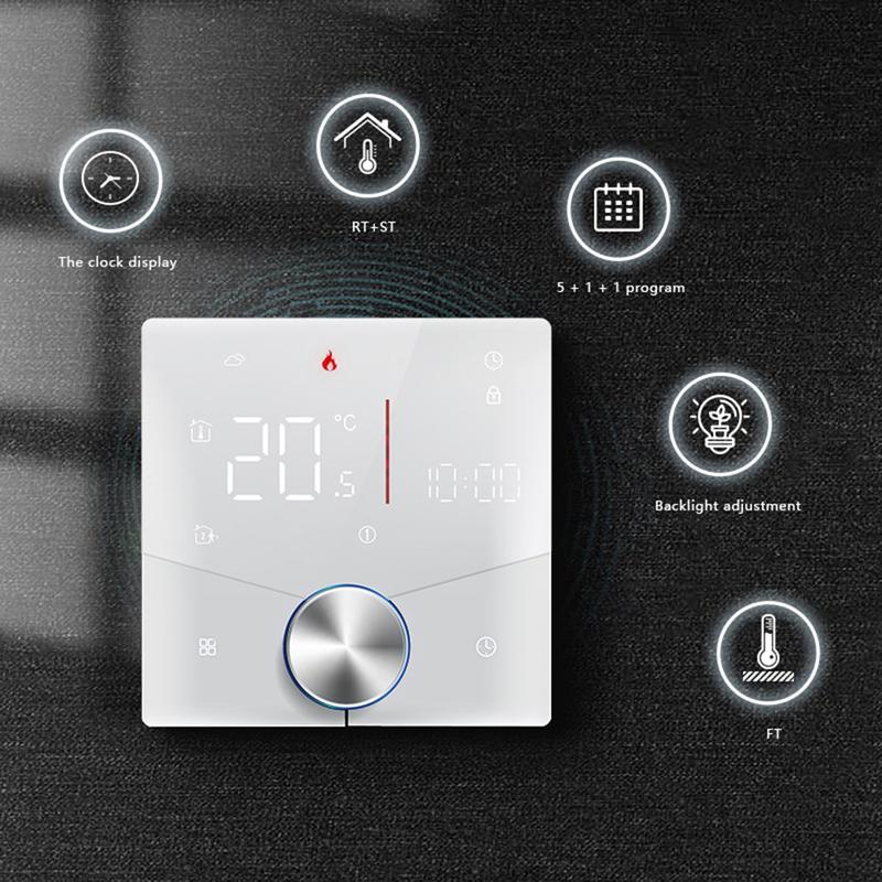 Termostatul inteligent Tuya BHT-009GCLW este conceput pentru a vă oferi un control precis și flexibil al temperaturii pentru sistemele de încălzire cu cazan, saune și alte sisteme de încălzire compatibile. Datorită designului său subțire și modern, conectivității inteligente și programării personalizabile, acesta contribuie la crearea unui mediu interior mai confortabil, facilitând în același timp gestionarea temperaturii. Acest termostat reprezintă o alegere practică pentru case, apartamente, hoteluri, spații de wellness și alte spații interioare similare.