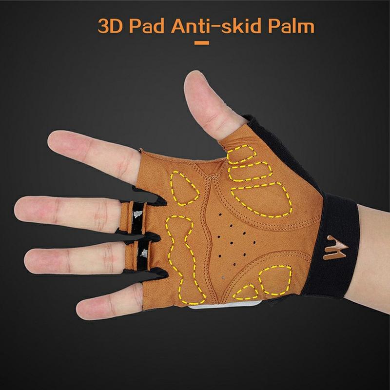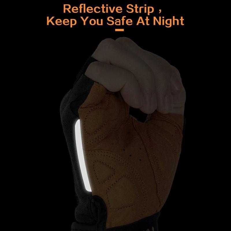 Proiectate ținând cont de bunăstarea și siguranța motociclistului, mănușile sunt prevăzute cu o țesătură de terry care evacuează transpirația pentru ștergerea rapidă a feței sau frunții, împreună cu elemente reflectorizante care sporesc vizibilitatea în timpul plimbărilor de noapte. Designul ergonomic cu jumătate de deget îmbunătățește controlul, aderența și ventilația, fiind ideale pentru ciclism pe distanțe lungi, MTB, ciclism rutier și navetism.
