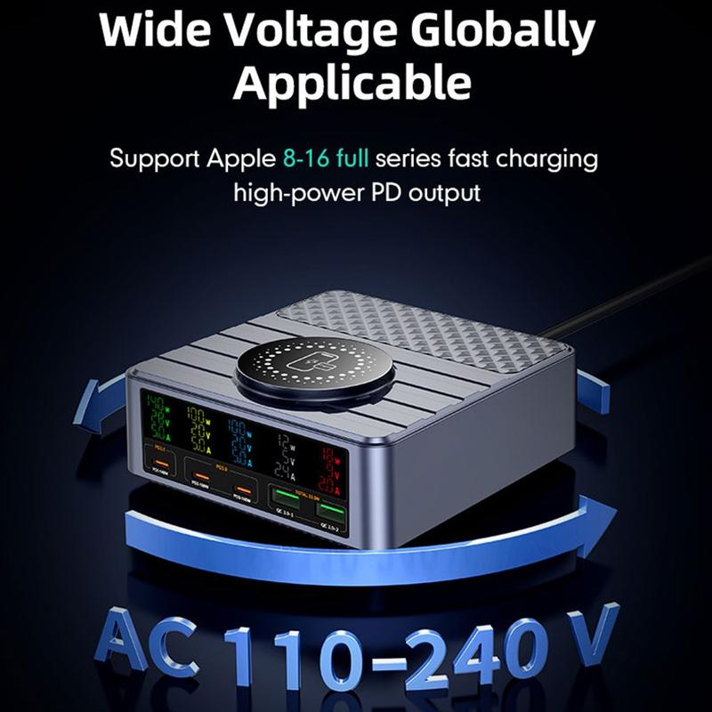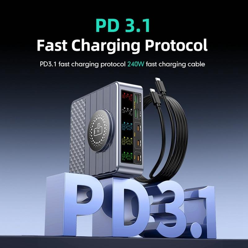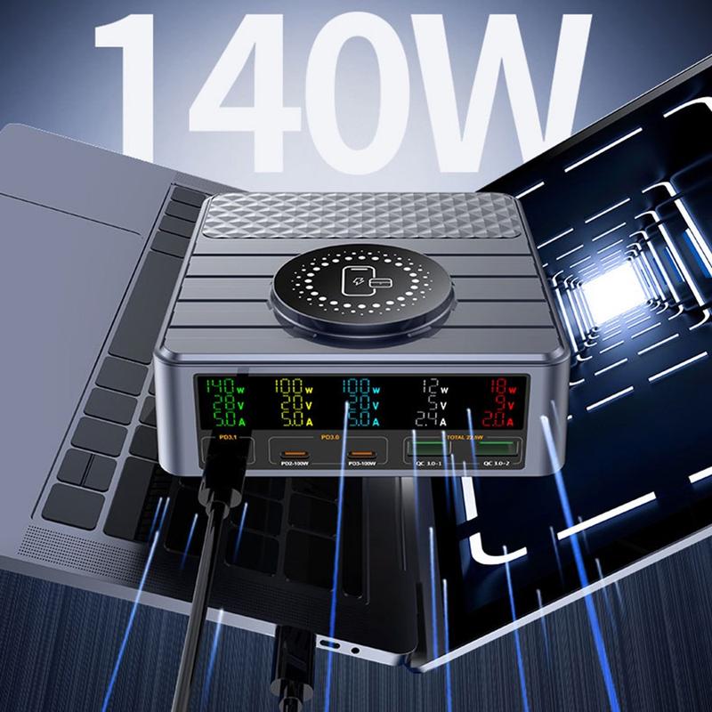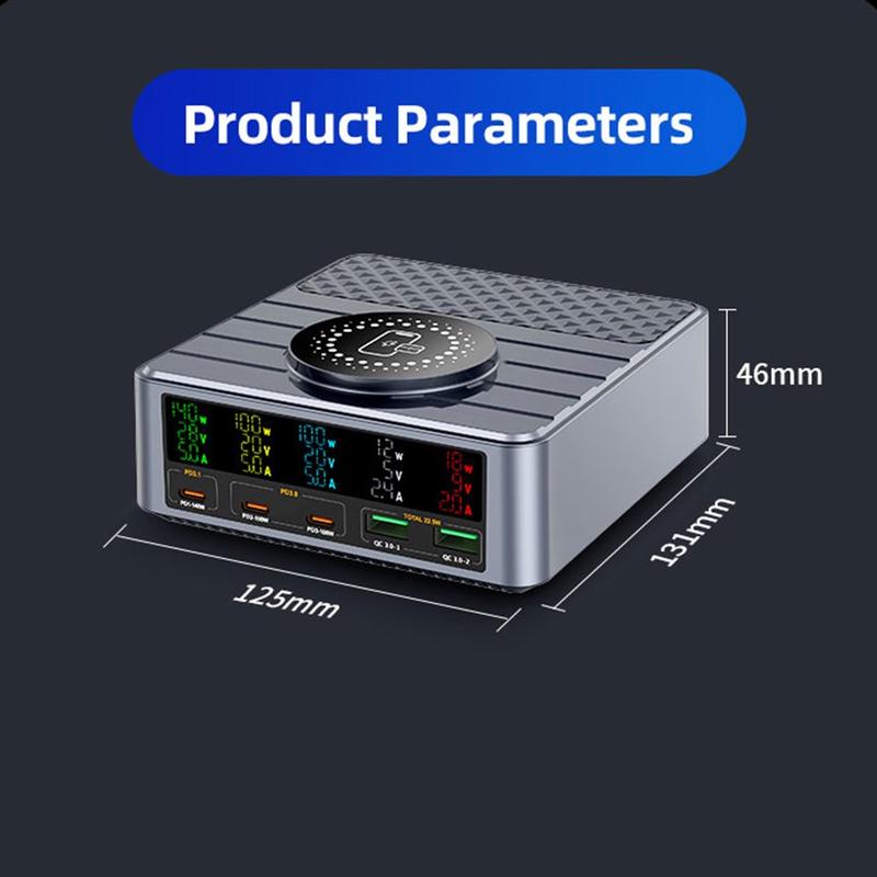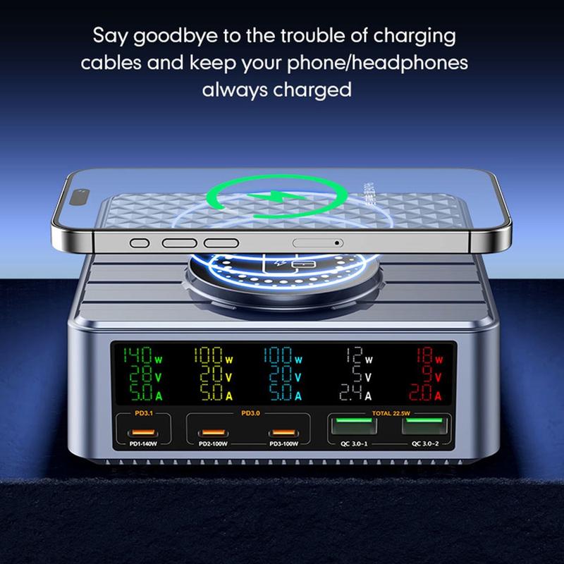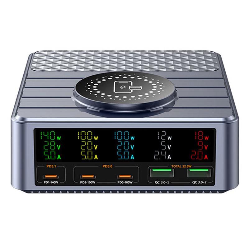 - Șase porturi de încărcare: 2× PD, 3× QC, 1× plăcuță de încărcare wireless