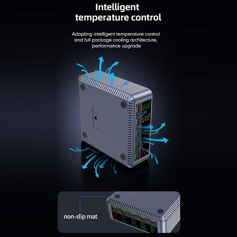 Afișajul digital încorporat oferă informații în timp real despre puterea de încărcare și starea porturilor, facilitând monitorizarea distribuției de energie. Cu protecție de siguranță în 9 straturi, încărcătorul asigură o funcționare sigură și stabilă pentru toate dispozitivele electronice conectate.