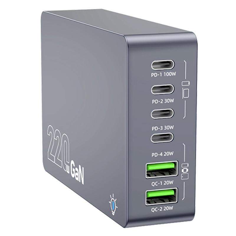 WLX-F8A 220W GaN Stație de încărcare pe birou - Adaptor încărcător rapid cu 6 porturi - mufă UE, 4x USB-C, 2x USB-A