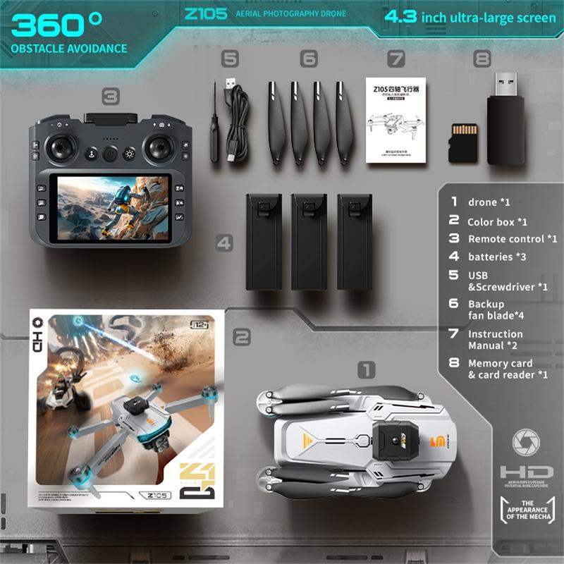Z105 Dual-Camera Smart Drone cu 4.3" Display Controller & 3 Baterii - Motor fără perii Evitare Obstacole Quadcopter