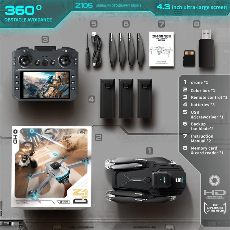 Z105 Dual-Camera Smart Drone cu 4.3" Display Controller & 3 Baterii - Motor fără perii Evitare Obstacole Quadcopter